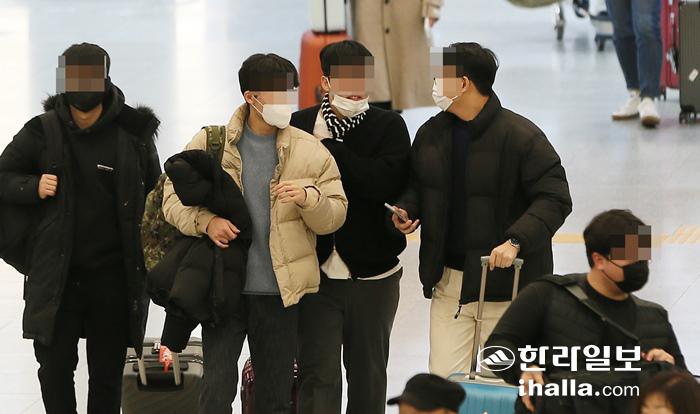 실내 마스크 의무 해제일인 30일 오전 제주국제공항 내 턱스크를 하거나 마스크를 벗은 관광객 등이 공항 대합실을 이동하고 있다.연합뉴스
