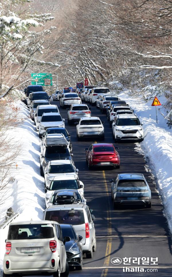 30일 어리목 입구 1100도로 양쪽으로 차량이 줄지어 주차돼 있다. 강희만기자