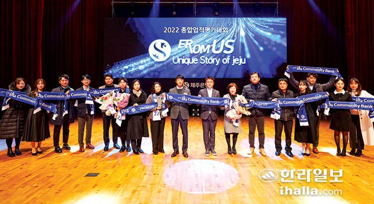 제주은행(은행장 박우혁)은 지난 28일 'From US'를 주제로 '2022 종합업적평가대회'를 3년 만에 대면 행사로 열고, 지난해 은행 발전에 기여하고 우수한 성과를 거둔 영업점과 직원들을 포상 격려했다.