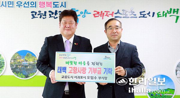 오임수 서귀포시 부시장이 지난 27일 '제30회 태백산 눈축제' 개막식에 초청을 받아 우호도시 태백시를 방문했다. 이상호 태백시장과 면담을 갖고 고향사랑 기부제 상호 홍보방안을 논의하는 한편 태백시에 직접 고향사랑기부금을 전달했다. 서귀포시는 앞으로도 고향사랑기부제를 적극 홍보할 방침이다.