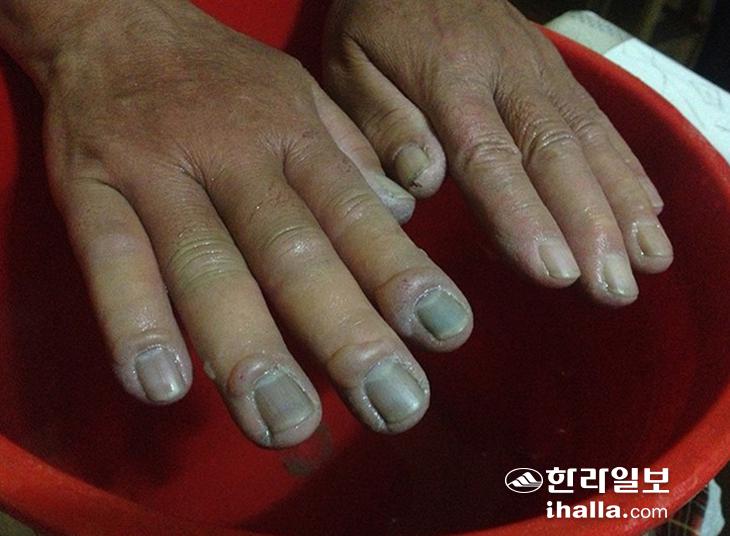 추위에 오랫동안 노출돼 손가락 조직이 손상된 모습.