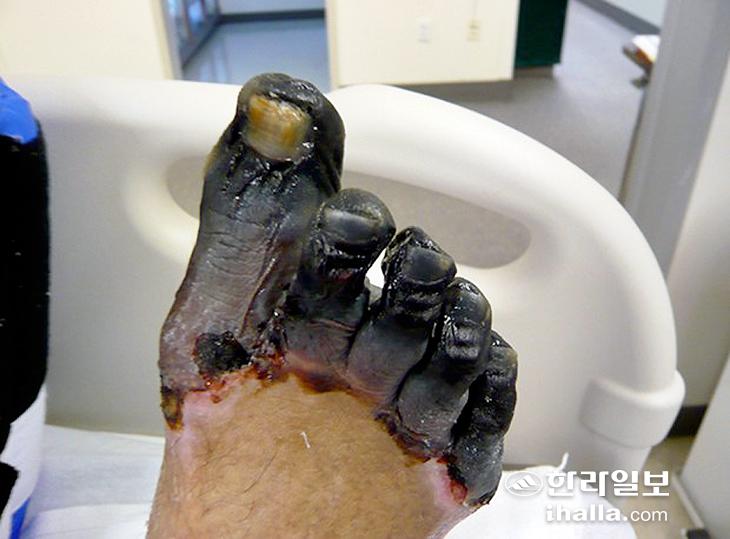 동상으로 인해 발가락 조직이 괴사되며 까맣게 변했다.