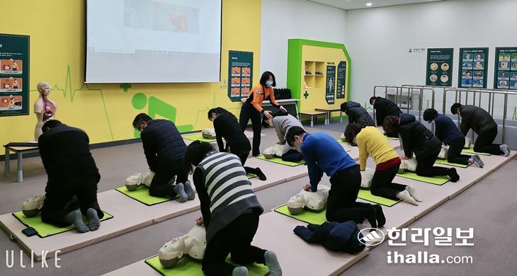 제주안전체험관을 찾은 도내 각급 학교 교장·교감들이 심폐소생술을 익히고 있다. 제주도교육청 제공