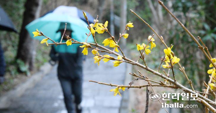 비가 내린 6일 제주시 사라봉등산로에 봄 꽃 개나리가 활짝 펴 있다. 이상국기자