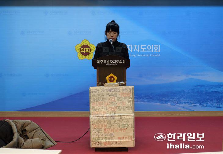 제주시 구좌읍 동복리 마을 개발위원 A 씨가 6일 제주도의회에서 기자회견을 열고 있다. 김도영기자