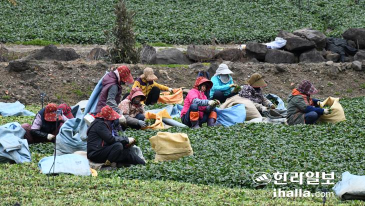 촉촉한 비가 내린 6일 제주시 애월읍 하가리 한 농경지에서 주민들이 취나물 수확 작업을 하고 있다. 강희만기자