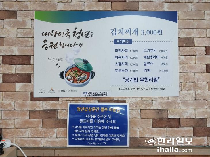 [한라일보 : 기사 수정 오후 2시 7분] '김치찌개 3000원'. 크게 오른 물가에 밥 한끼 사먹는 게 부담되는 요즘 같은 때에도 단돈 천 원짜리 세 장에 배불리 밥을 내주는 식당이 있다. 지난달 30일 제주시 이도2동에 문을 연 '청년밥상문간 제주점'이다.
