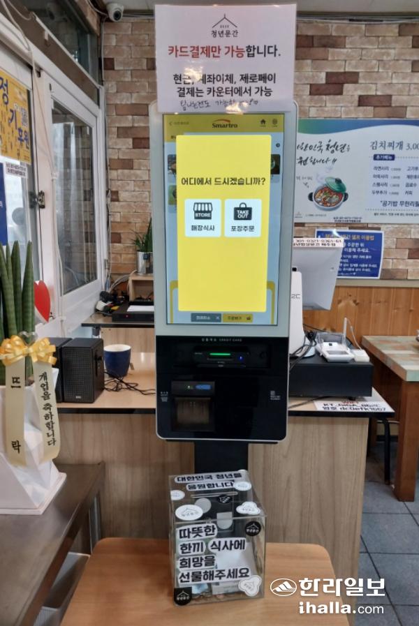 청년밥상문간 제주점 무인주문대 아래 모금함이 놓여 있다.