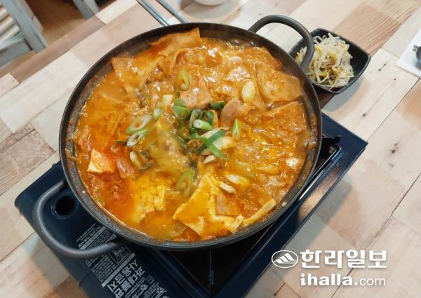 청년밥상문간 제주점에서 판매하고 있는 '김치찌개'. 3000원짜리 찌개를 주문하면 찌개와 콩나물 반찬, 밥과 숭늉을 먹을 수 있다. 김지은기자