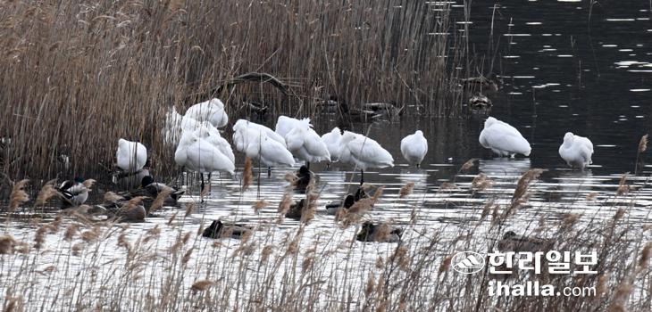 겨울을 나기 위해 제주를 찾은 저어새(천연기념물 제205-1)들이 7일 하도철새도래지에서 강한 바람을 피해 휴식을 하고 있다. 강희만기자