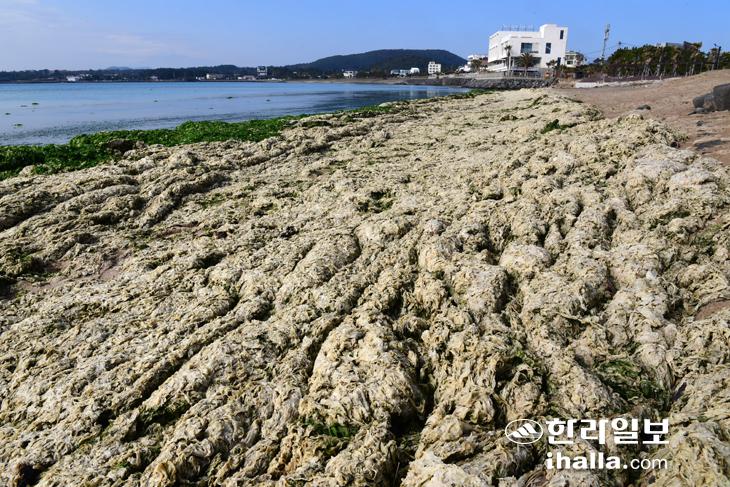 9일 서귀포시 성산읍 신양해수욕장에 많은 양의 파래가 쌓여 있어 미관을 흐리게 하고 있다. 강희만기자