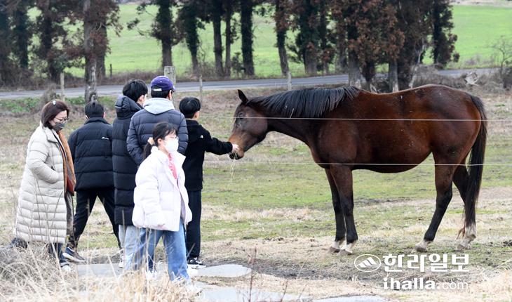 지난 11일 제주시 한림읍 성이시돌목장을 찾은 관광객들이 말에게 먹이를 주고있다. 이상국기자