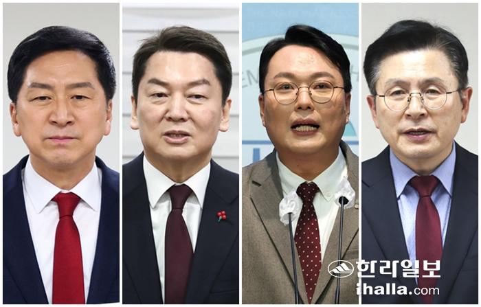 국민의힘 당 대표 선거 본경선 진출 후보들. 왼쪽부터 김기현 안철수 천하람 황교안. 연합뉴스