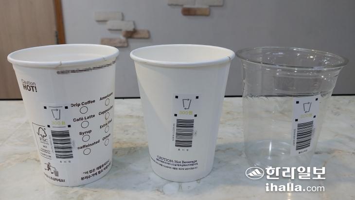 지난 8일 제주시 패스트푸드점 1곳과 카페 2곳에서 구입한 음료 3잔. 음료가 담긴 일회용컵에 붙어 있는 라벨에는 '300원'이라는 가격과 바코드가 찍혀 있다. 김지은기자