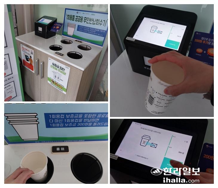 제주시 삼도1동주민센터 입구에 설치된 무인회수기에서 일회용컵을 반납하고 있다.