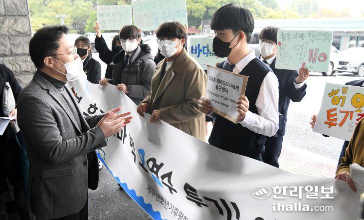 제주청소년기후평화행동 단원들이 13일 기자회견 이후 오영훈 제주도지사 면담을 요청하는 서한을 전달하기 위해 제주도청을 항의 방문하고 있다. 강희만기자