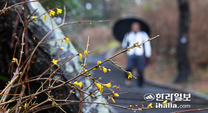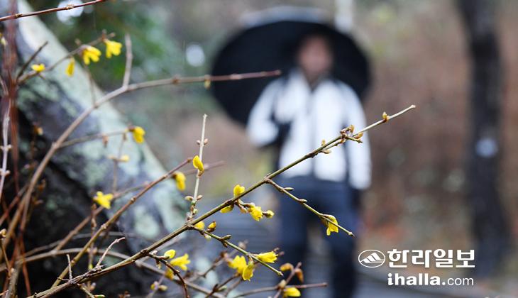 [한라일보] 겨울비가 촉촉히 내린 13일 제주시 사라봉공원에 개나리가 피어 시선을 사로잡고 있다. 제주지방은 14일 비가 잠시 그쳤다가 15일부터 다시 비가 내리겠다.
