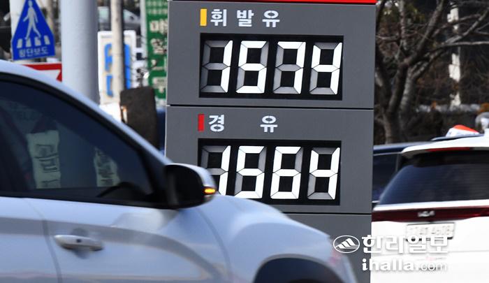 14일 제주시 한 주유소 유가정보를 나타내는 안내판에 휘발유 가격이 경유 가격보다 높게 표시되고 있다. 이상국기자