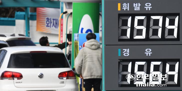 14일 제주시내 한 주유소의 유가정보를 나타내는 안내판에 휘발유 가격이 경유 가격보다 높게 표시돼 있다. 이상국기자