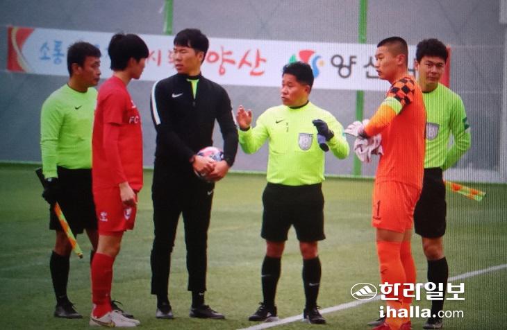 15일 경남 양산시 천성산체육공원에서 열린 제54회 부산MBC 전국고교축구대회 예선 1조 2차전 대기고와 서울 광진 U18과의 경기 킥오프에 앞서 양 팀 주장이 주심으로 부터 얘기를 듣고 있다. 오른쪽이 대기고 골키퍼이면서 주장인 강성혁.