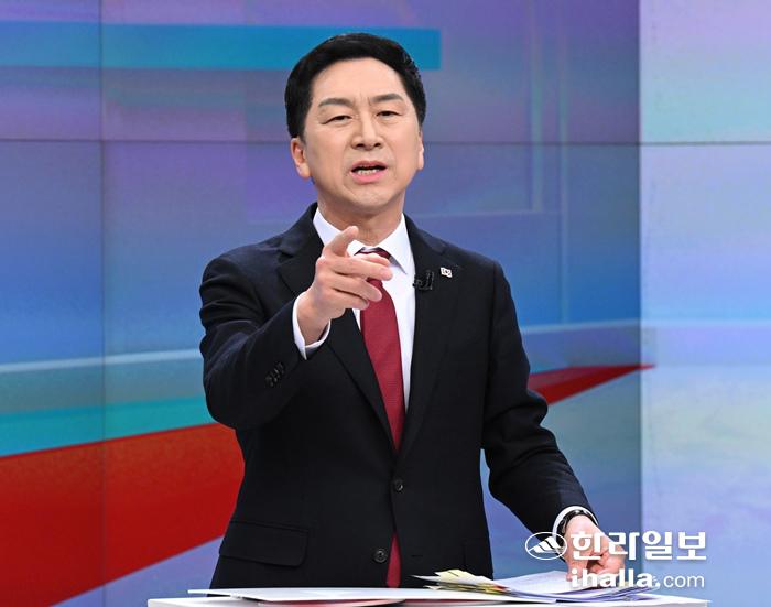 15일 서울 중구 TV조선 스튜디오에서 열린 국민의힘 당대표 후보 첫번째 TV토론에 앞서 김기현 후보가 토론회를 준비하고 있다. 연합뉴스