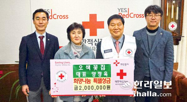 오색꽃집(대표 양정옥)은 지난 14일 대한적십자사제주특별자치도지사(회장 정태근)를 방문해 소외된 이웃을 위한 희망나눔 특별성금 200만원을 전달했다.