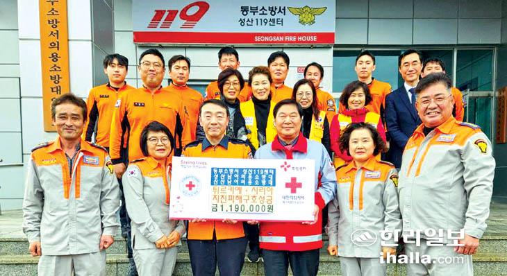 동부소방서 성산119센터(센터장 임태진)와 성산의용소방대(대장 김법수·홍재영) 신산의용소방대(대장 이충흡·김연자)는 지난 15일 센터 회의실에서 튀르키예와 시리아 강진 피해와 관련해 전 대원의 뜻을 모은 성금 119만원을 대한적십자사 제주지사(회장 정태근)에 기탁했다.
