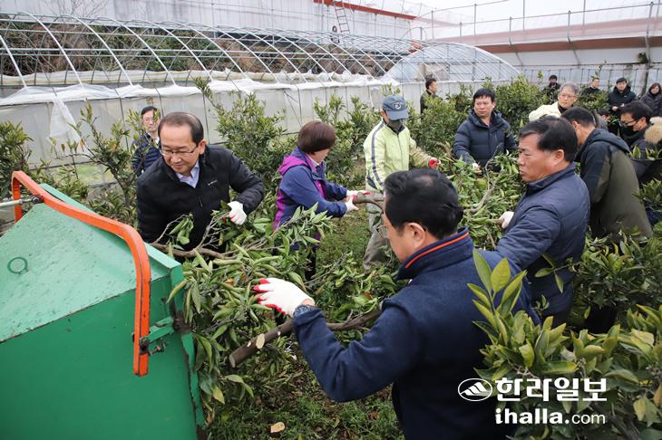 17일 제주시 애월읍 수산리의 감귤원에서 강병삼 제주시장 등 감귤원 간벌 실천 결의대회 참가자들이 간벌 작업 시연을 하고 있다. 제주시 제공