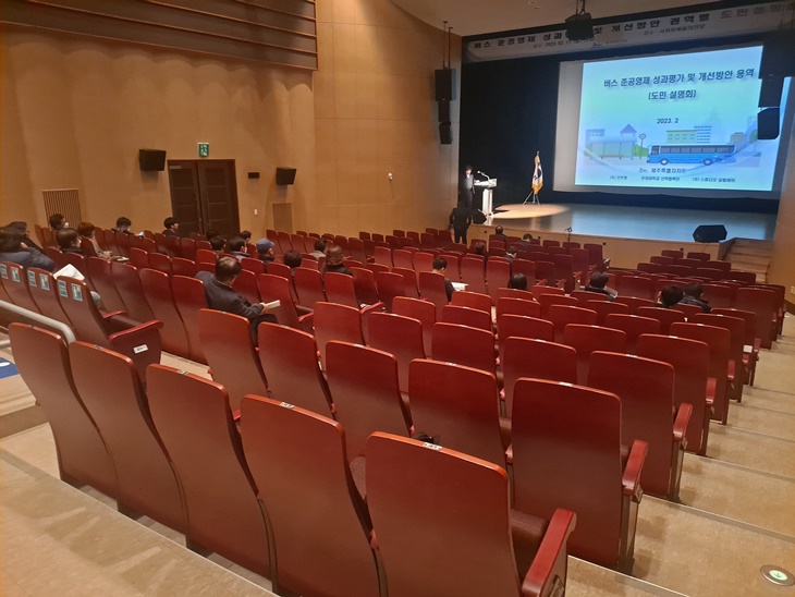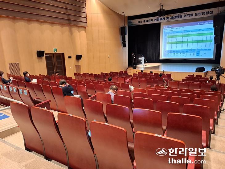 제주도가 17일 서귀포예술의전당에서 "버스 준공영제 성과평가 및 개선방안 용역'에 따른 도민설명회를 개최했으나 참석자는 관계 공무원을 포함해 30여명에 불과했다. 지난해 10월 5일 같은 장소에서 열린 첫 도민설명회에서 공무원과 용역진, 취재원 등을 포함해 10여명에 뿐이었고 이번에도 달라진 모습은 없었다. 설명회의 질의 응답시간도 시민 불만이 빗발치자, 20분 만에 끝내며 도는 설명회를 서둘러 마치려는 모습을 보였다.