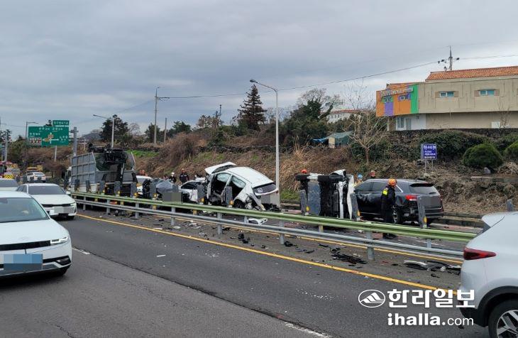 18일 대형 교통사고가 발생한 애월읍 광령리 무수천사가로교차로 현장. 제주서부소방서 제공