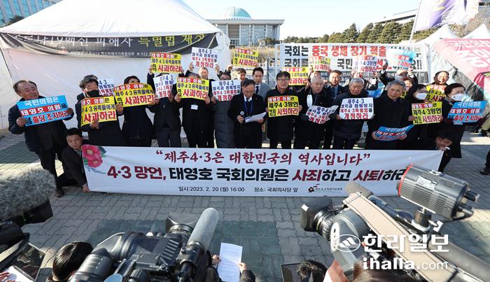 4·3희생자유족회 관계자 등이 20일 오후 서울 여의도 국회 앞에서 최근 '제주 4·3 사건'이 북한 김일성의 지시에 의해 촉발됐다는 발언으로 논란을 빚은 국민의 힘 태영호 의원 규탄 기자회견을 하고 있다. 연합뉴스