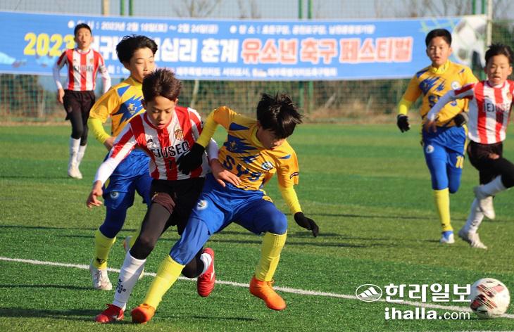 지난 20일 2023서귀포시 공천포구장에서 열린 서귀포 칠십리유소년축구페스티벌 1차 리그 예선 16조 제주서초와 신용산초의 경기에서 제주서초의 강민규(왼쪽 줄무늬)가 신용산초의 수비를 뚫기 위해 몸싸움을 벌이고 있다.
