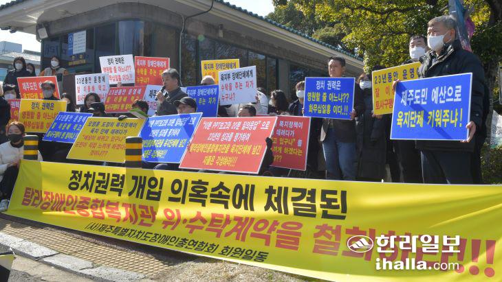 지난 21일 제주자치도장애인총연합회가 제주도청 앞에서 기자회견을 열고 탐라장애인종합복지관 관리주체 변경 의혹을 제기하고 있다. 이상국기자