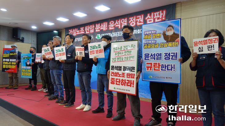 민주노총 제주본부와 건설노조 제주지부 관계자들이 27일 제주도의회에서 기자회견을 열고 있다. 김도영기자
