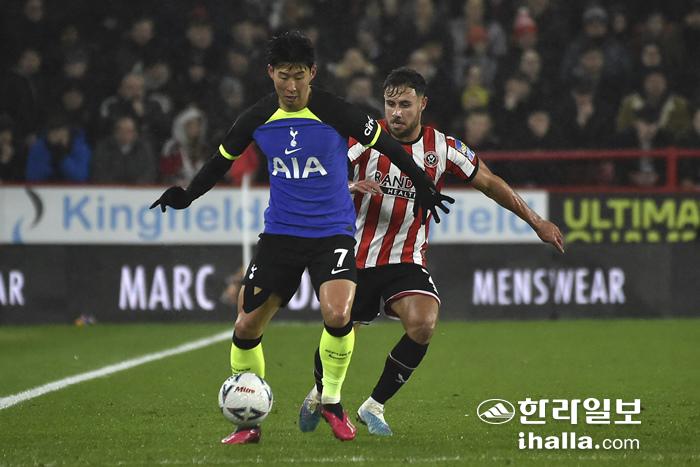 2일 셰필드 유나이티드(2부)와의 2022-2023 FA컵 5라운드(16강전)에 선발 출전,상대 선수와 볼 다투는 손흥민. 연합뉴스