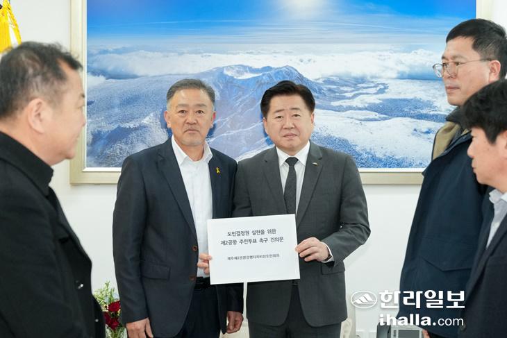 제주 제2공항 강행저지비상도민회의(공동대표 강원보)는 3일 제주도청에서 오영훈 제주도지사와 면담을 갖고 제2공항에 대한 주민투표 등의 내용이 담긴 건의서를 전달하고 있다.