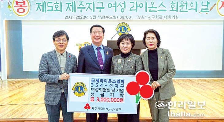 국제라이온스협회 354-G(제주)지구(총재 박기서)는 최근 지구회관 대회의실에서 '제5회 제주지구 여성 라이온스 회원의 날'을 기념해 이웃사랑 성금 300만원을 제주사회복지공동모금회(회장 강지언)에 기탁했다.
