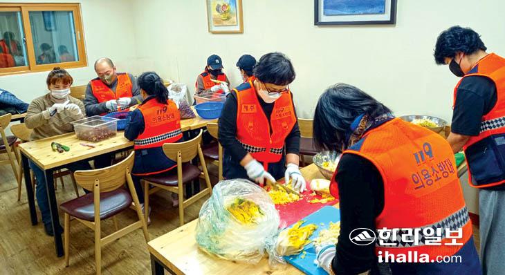 제주소방서 외도남·여의용소방대(대장 김동주·김정미)는 최근 제주시 외도일동에 위치한 성지요양원을 방문해 김치 만들기와 주방보조 배식 봉사활동을 실시했다.