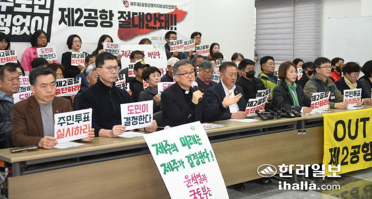 제주제2공항강행저지비상도민회의(이하 비상도민회의)는 7일 민주노총 제주본부에서 기자회견을 열고 "기어코 환경부가 '조건부 동의'라는 면피용 편법을 악용해 제2공항전략환경영향평가를 통과시켰다. 거짓·부실 제2공항 전략환경영향평가 통과를 규탄한다"며 "도민 결정 없는 제2공항 추진은 있을 수 없어 주민투표를 실시하라"고 말했다.