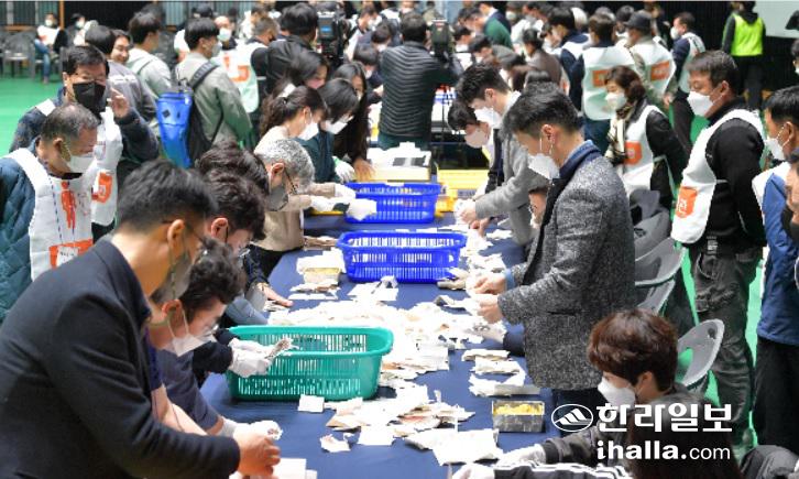 제3회 전국동시조합장선거가 치러진 8일 투표 마감후 한라체육관에서 개표 작업이 진행되고 있다. 이상국기자