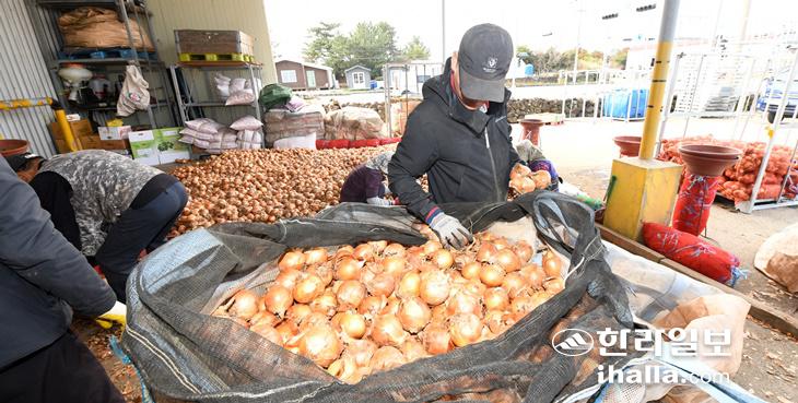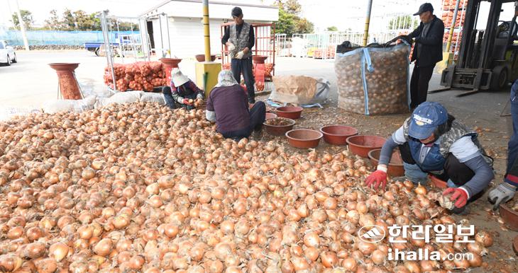 [한라일보] 9일 제주시 조천읍 양파 창고에서 농민들이 보관중이던 양파를 출하하기 위해 작업하고 있다. 이상국기자