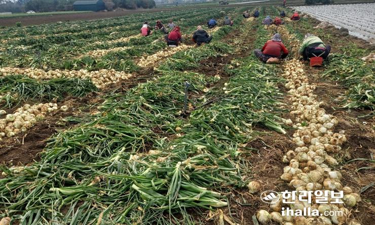 [한라일보] 코로나19로 인한 소비침체 여파로 지난해 값이 폭락했던 제주산 조생양파가 올해는 가격 호조세가 예상되는 가운데 며칠 전 주산지인 서귀포시 대정지역에서 출하가 시작됐다. 제주산 조생양파 재배면적이 평년보다 20% 이상 증가했지만 좋은 값이 기대되는 것은 전국 면적이 소폭 감소한데다 무엇보다 양파 재고량이 평년보다 10% 이상 줄어든 영향으로 풀이된다.
