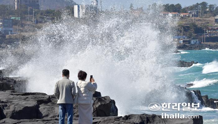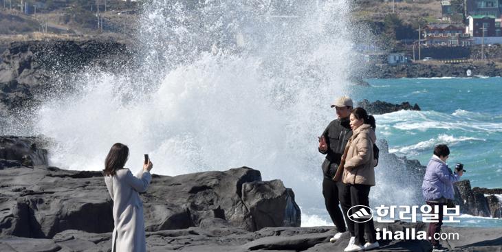 [한라일보] 13일 제주시 애월읍 구엄리돌염전을 찾은 관광객들이 높은 파도를 배경으로 기념사진을 찍고 있다. 이상국기자