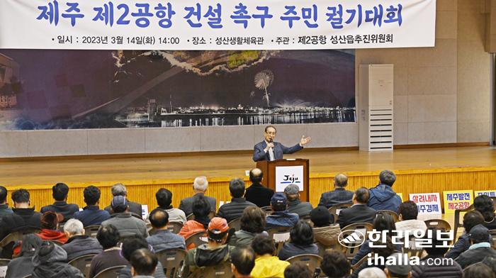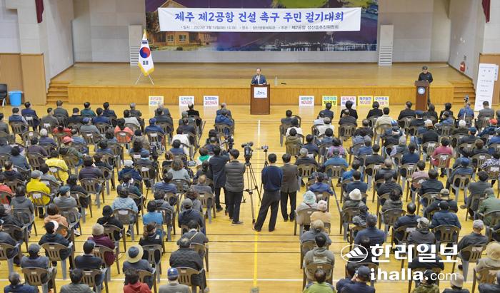 제2공항 성산읍추진위원회가 14일 성산생활체육관에서 '제주 제2공항 건설 촉구 주민궐기대회'를 개최하고 정부와 행정의 조속한 건설을 촉구했다. 이상국기자