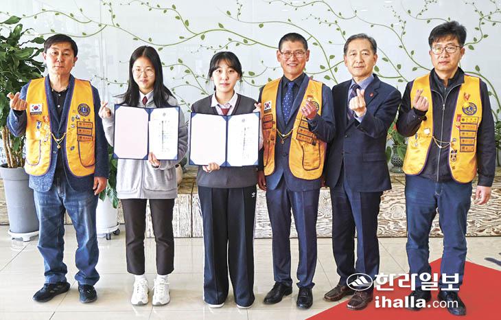 대정여자고등학교(교장 이영훈)는 14일 학교 비전홀에서 모슬포라이온스클럽(회장 유관수) 창립 46주년 기념 장학금 전달식을 가졌다. 이날 행사에서 유관수 모슬포라이온스클럽 회장과 임원진은 2학년과 3학년 등 2명의 학생에게 장학증서와 장학금을 전달했다.