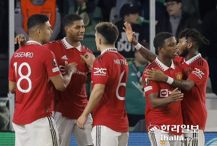래시퍼드의 골에 기뻐하는 맨유 선수들. 연합뉴스