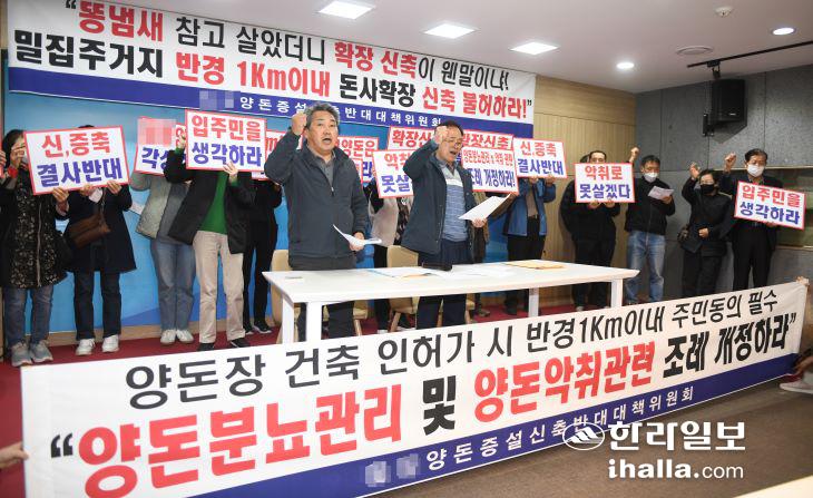 A양돈장 증설 신축허가 반대대책위원회와 주민들이 20일 제주도의회 도민카페에서 기자회견을 열고 있다. 이상국기자