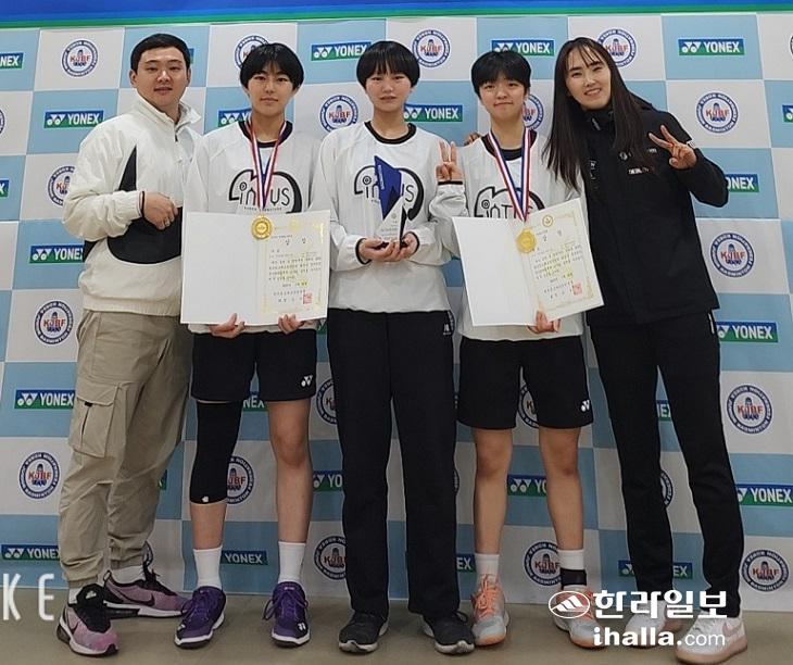 여고부 단체전에서 3위를 차지한 제주여고. 왼쪽부터 허원보 감독, 오연주, 고보민, 부서연, 조아라 지도자.