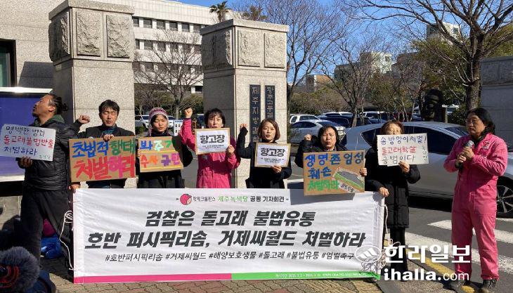 올해 2월 제주녹색당과 해양환경단체 핫핑크돌핀스가 큰돌고래 무단 이송 사건에 대한 검찰의 기소유예 처분을 비판하는 기자회견을 여는 모습. 한라일보 자료사진