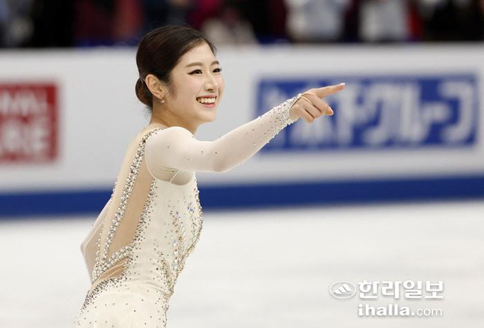 피겨스케이팅 여자 싱글 이해인이 24일 일본 사이타마 슈퍼 아레나에서 열린 2023 국제빙상경기연맹(ISU) 피겨스케이팅 세계선수권대회 여자 싱글 프리스케이팅에서 연기를 마친 뒤 관중석을 향해 세리머니를 하고 있다.연합뉴스